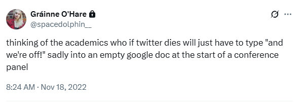 Less than a week ago when everyone was convinced Twitter was about to die quietly in the small hours of the morning and the timeline was filled with heartfelt dedications to online friends, I posted a joke about what the demise of the platform would mean for the future of online engagement during academic conferences.